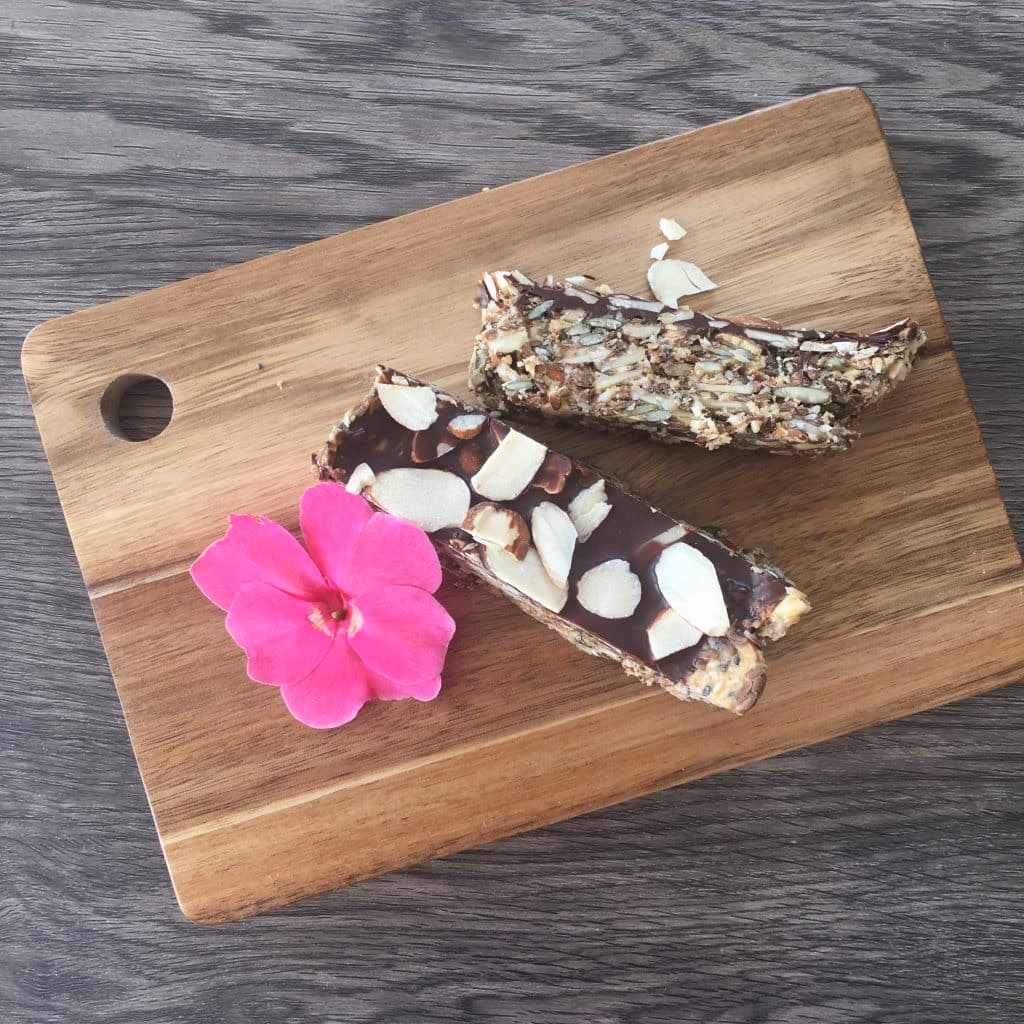 3.Steg 3 - Rør i sjokolade ruter i den smeltete kokosoljen og topp så blandingen over baren i brødformer.