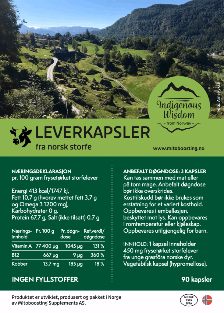 Innhold: 90 kapsler. 1 kapsel inneholder 422 mg frysetørket lever fra norske grasfôra storfe.